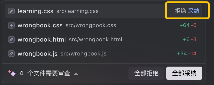 ● 处理多文件内的所有代码变更 : 点击输入框上方待审查文件列表中的 全部采纳 或 全部拒绝 按钮,批量接受或拒绝当前项目中的所有代码变更。