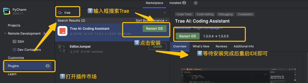 ● 新用户: 在Pycharm中 搜索「Trae」并安装,重启 VSCode,重启成功后登录帐号;
