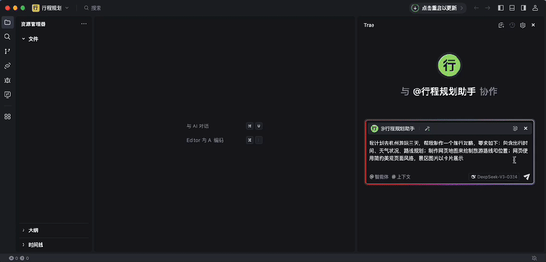 3.输入你的需求并发送(例如:我计划去杭州游玩三天,帮我制作一个旅行攻略,要求如下:包含出行时间、天气状况、路线规划;制作网页地图来绘制旅游路线和位置;网页使用简约美观页面风格,景区图片以卡片展示)。