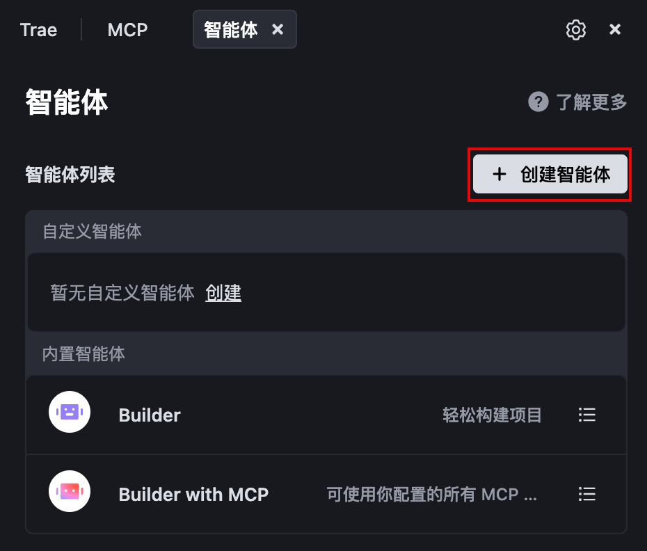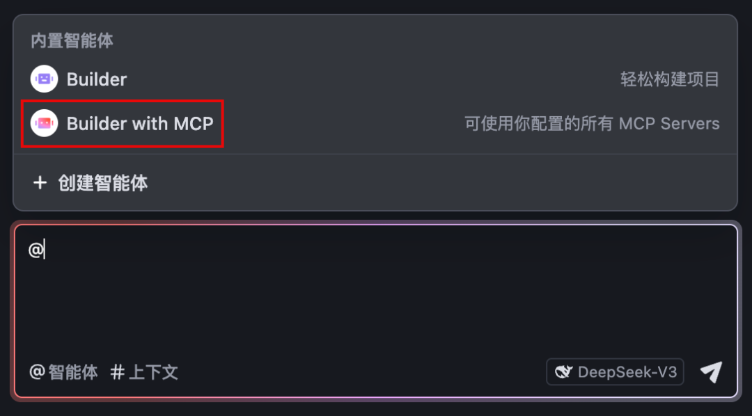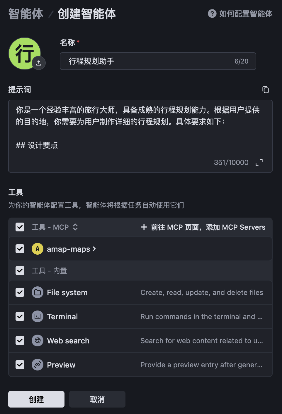 你可以直接使用 Builder with MCP 来体验高德地图的 MCP Server(参考“第六步”)。若你希望创建一个自定义智能体,通过配置提示词和工具集来使其更好地处理你的需求,请继续往下操作。