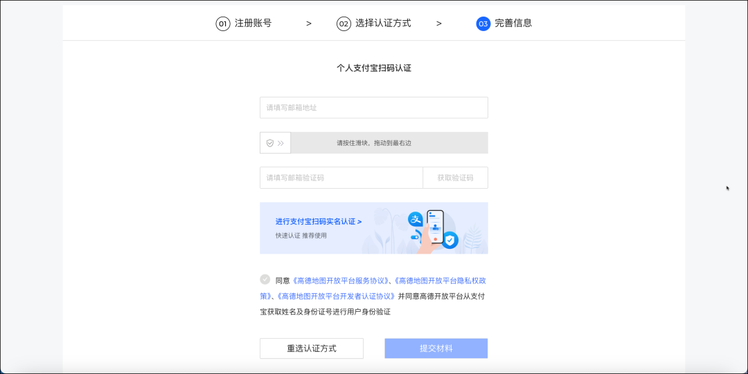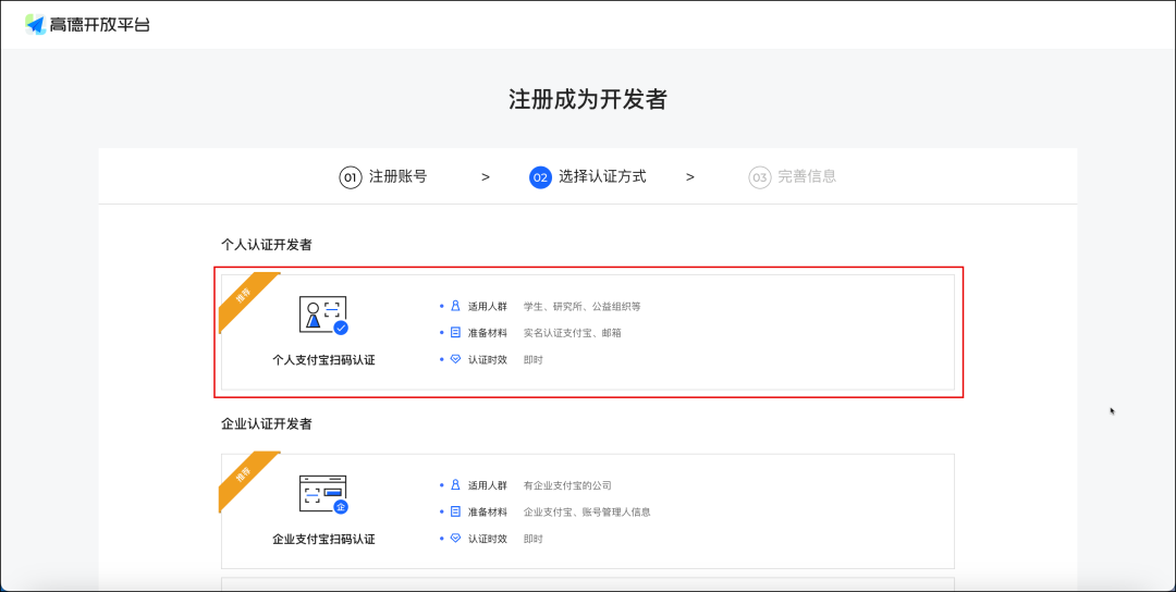3.在 个人认证开发者 部分,选择 个人支付宝扫码认证 。