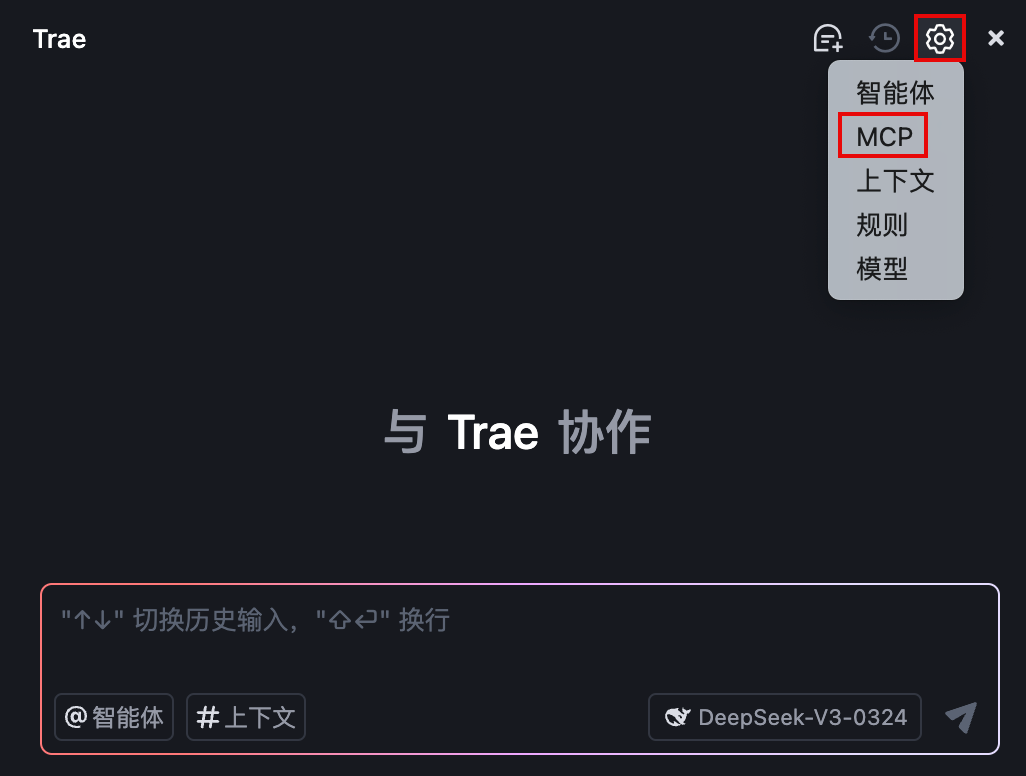 2.在 AI 对话框的右上角,点击 设置 图标,然后在菜单中选择 MCP 。
