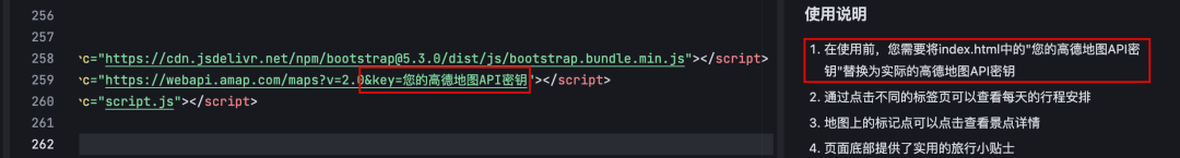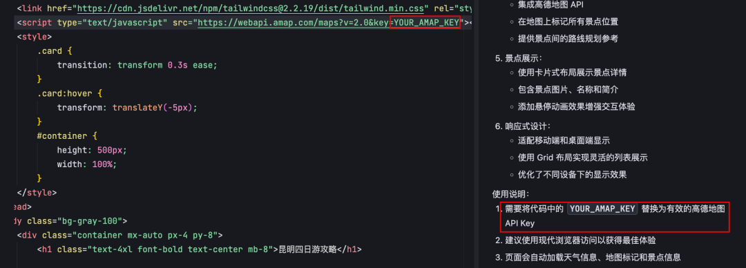 若智能体提示你将代码中的 YOUR_AMAP_KEY(也可能是意思相同的其他内容形式,你可以在 .html 文件中搜索关键词 “key” 来定位)替换为有效的高德地图 API Key,则需要操作此步骤,从而确保地图内容可以在 .html 文件中正常展示。