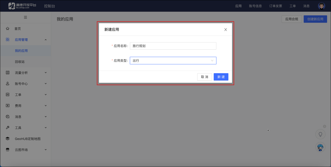 7.输入任意应用名称,将应用类型设置为 出行 ,然后点击 新建 按钮。
