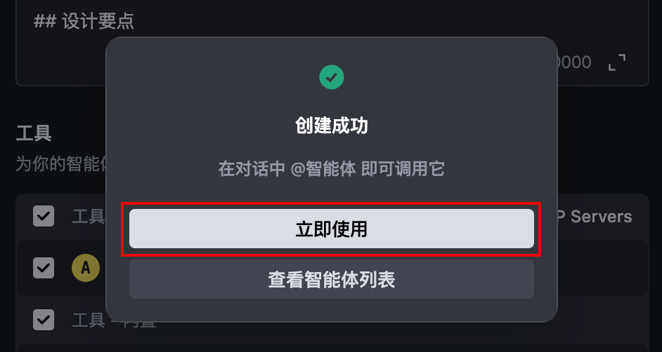 智能体创建成功。点击 立即使用 按钮,开启与智能体的对话。