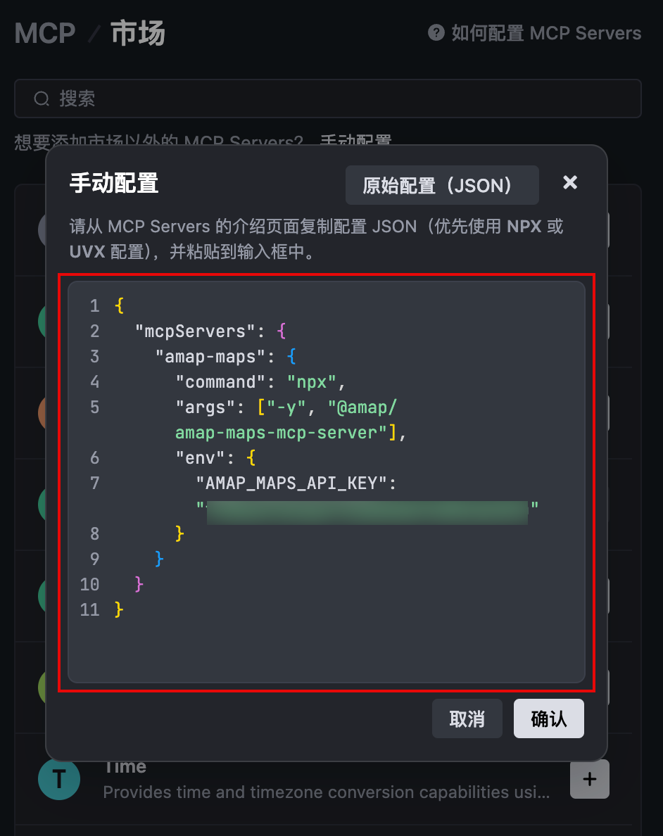 5.在输入框中粘贴以下配置内容。AMAP_MAPS_API_KEY 部分需要填入 “第三步” 在高德开放平台上创建的 Key。
