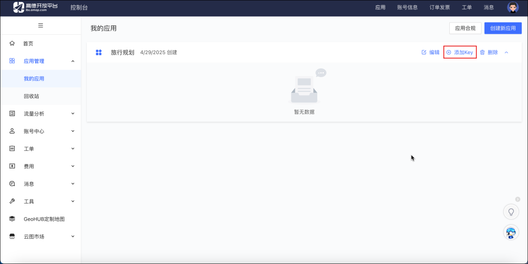 8.应用创建完成后,点击应用条目右侧的 添加 Key 按钮。