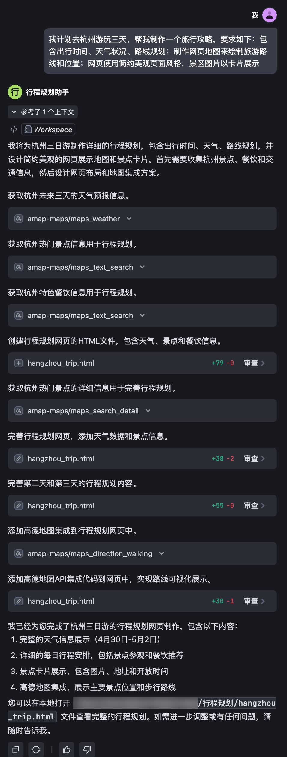 以下示例中,作者使用配置了 MCP Server(amap-maps)的”行程规划助手“制作了一个杭州三日游行程规划。