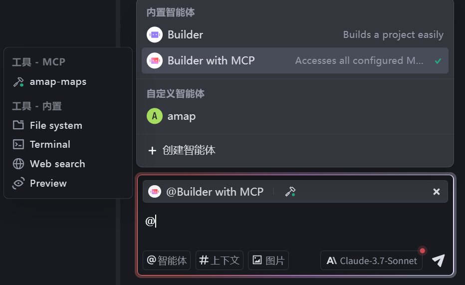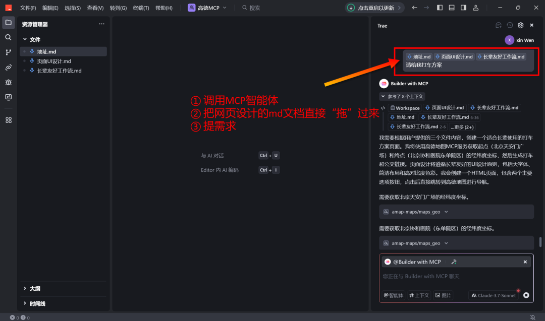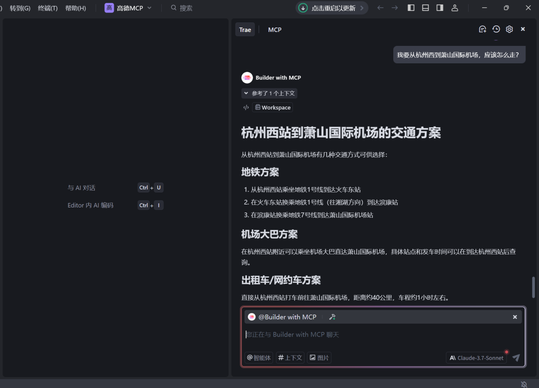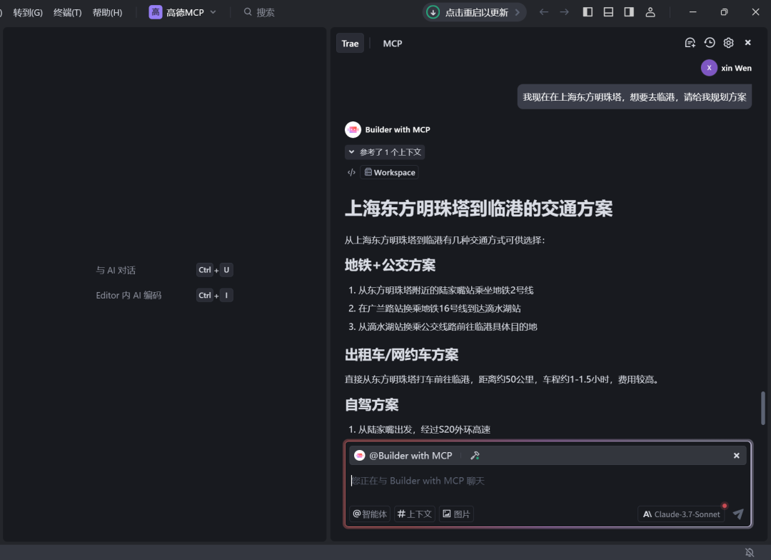 1.使用Trae,选择**@智能体 MCP(Builder with MCP)** ,可以看到我们刚刚配置的高德 MCP**(amap-maps)** ,然后告诉起点和终点,让给出规划方案,进行验证。