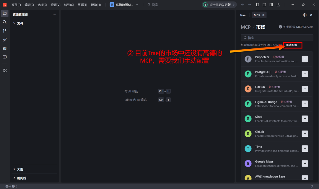 1.打开 Trae 新建一个文件夹后,点击“设置”-“MCP”-“手动配置”: