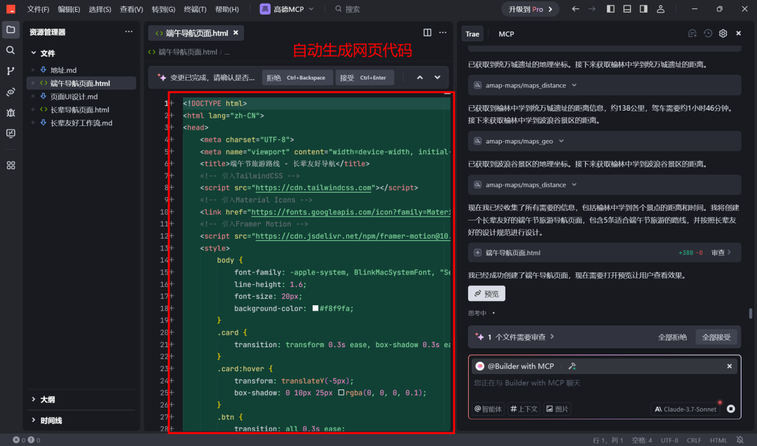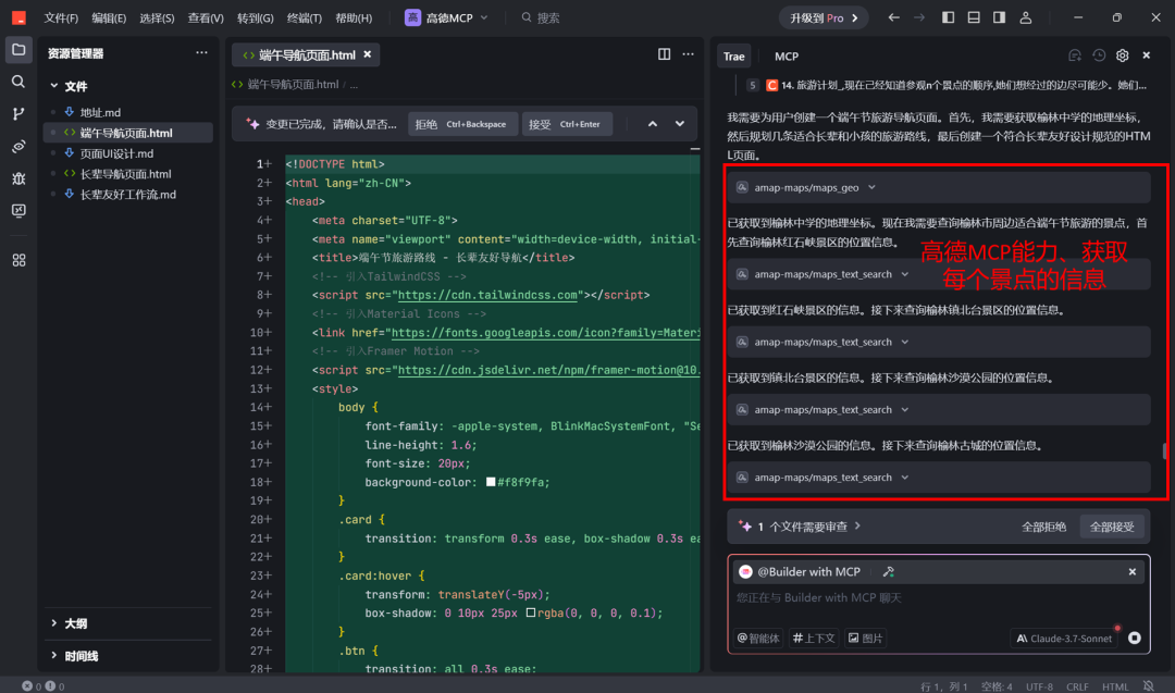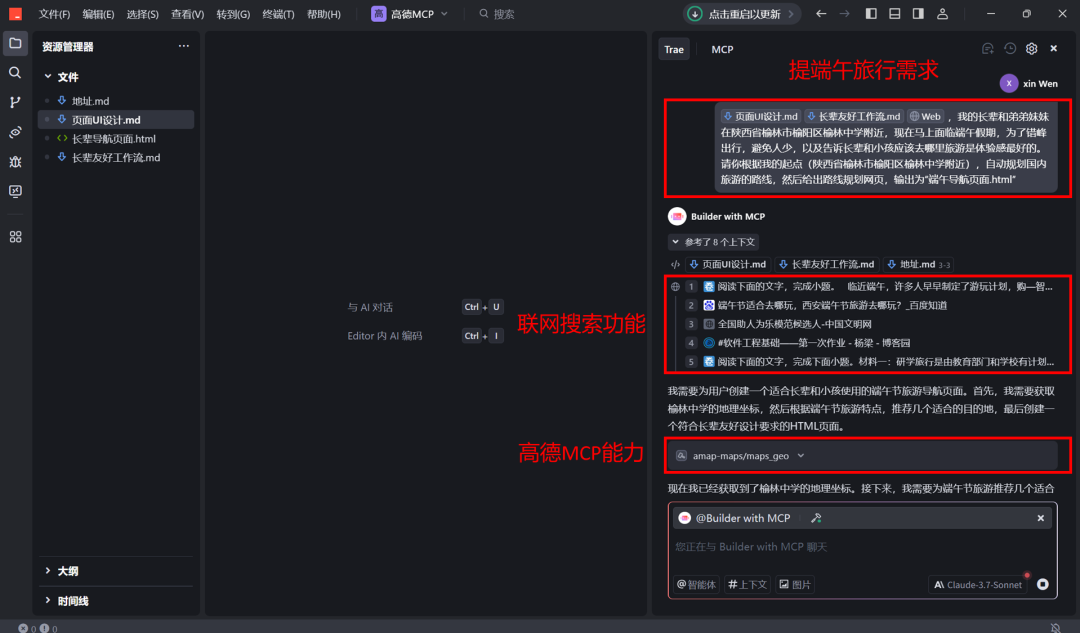 1.提端午出行需求 ,并且开启联网功能 ,Trae 会调用高德 MCP 功能