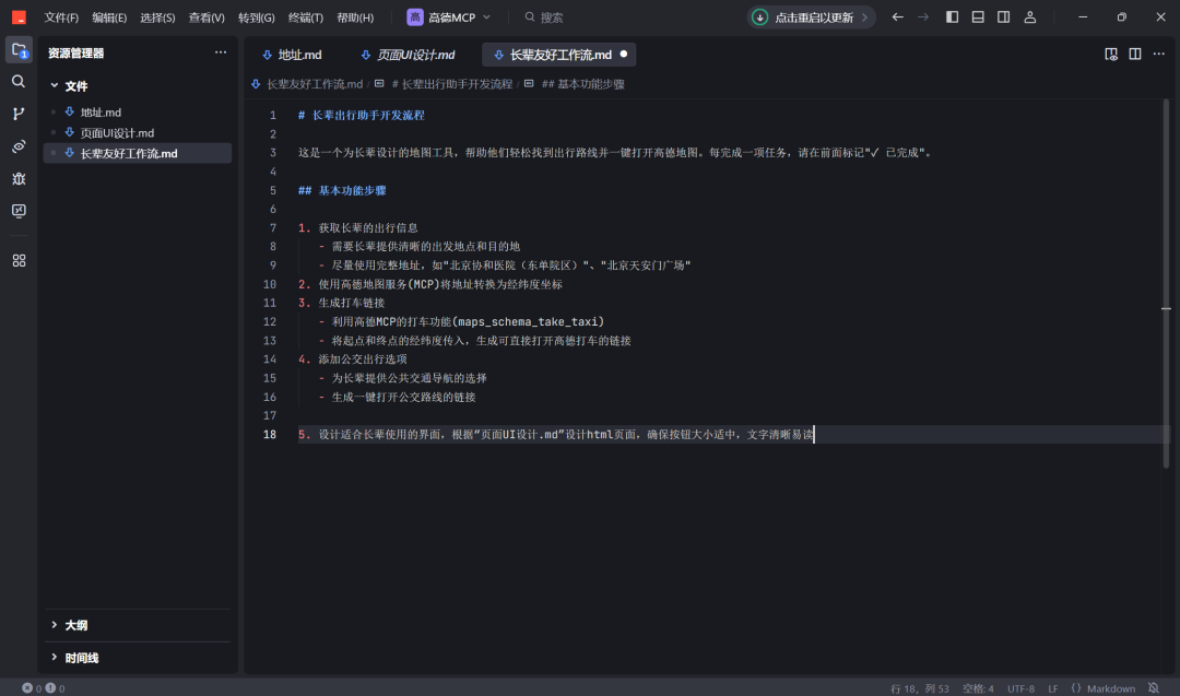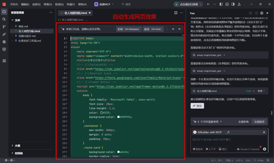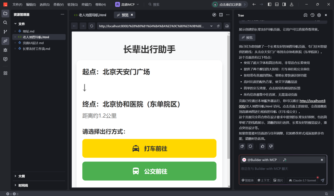 我在想,既然已经配置了高德 MCP ,而且还有 Trae 工具在手,何不再进一步 ,做个长辈/小孩友好的路线规划网页呢?反正 Trae 也可以根据我的需求生成 html 网页,自动的排版、优化、布局、设计,为什么不能再优化完善一下呢?