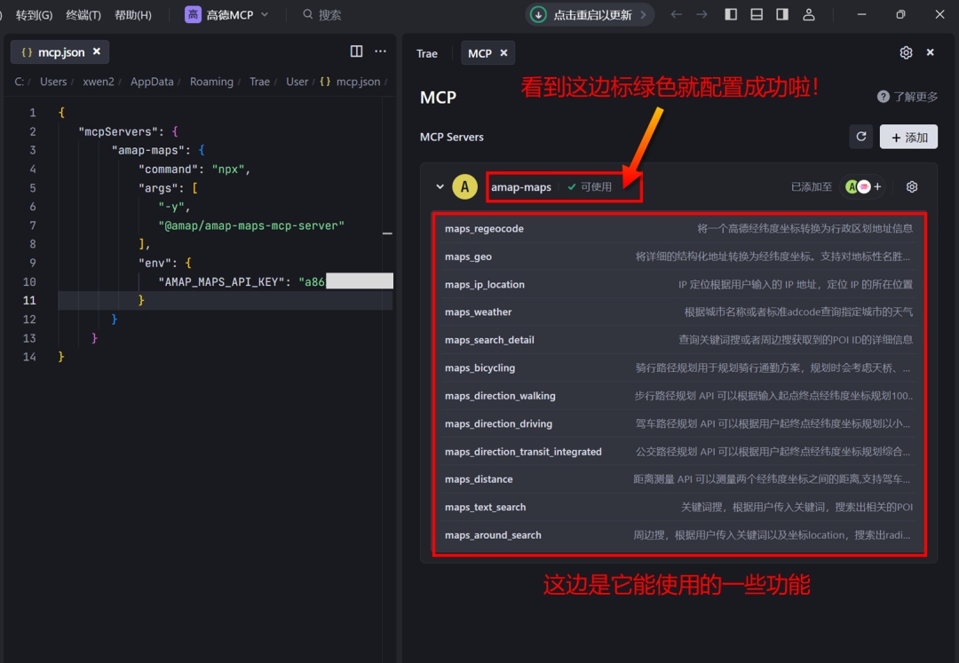 ● 使用 Trae 工具配置了高德地图 MCP ,让 AI 拥有了调用高德地图的能力