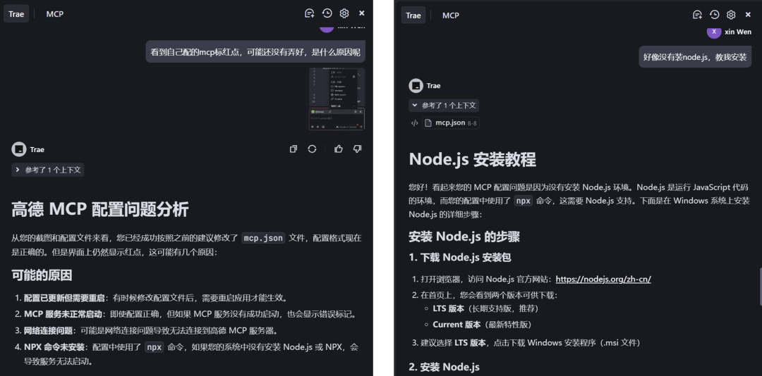 4.经过 AI 的分析,发现可能是没有安装 node.js ,具体是什么,咱也不懂咱也不知道,那就按照它说的来吧!让它教我一步步安装: