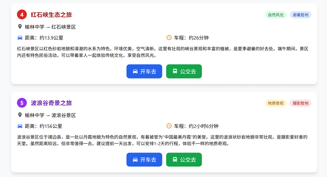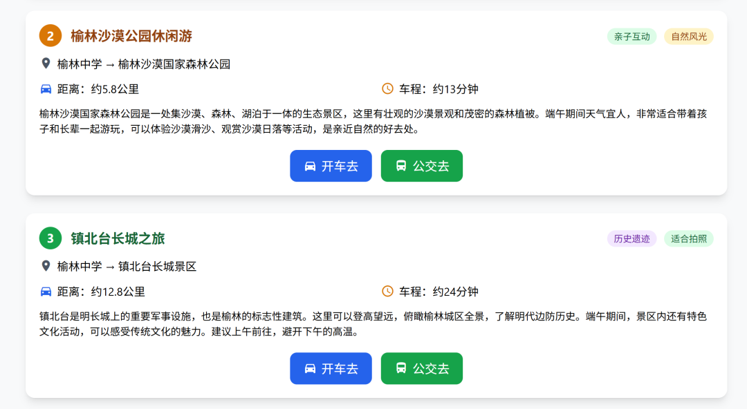 自己配置的功能直接输出网页,并且配色、布局皆自动化,输出长辈/小孩友好的网页 ,清晰明了的展示了几条附近旅游路线,页面特点为: