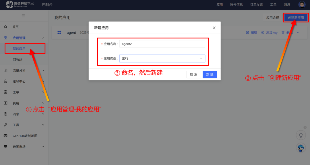 4.授权成功后,点击应用管理-我的应用-创建新应用,然后进行创建: