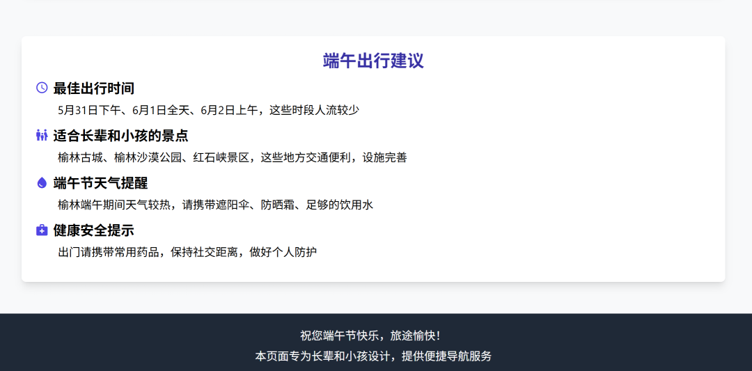 - 错峰出行建议 :提供了端午节期间错峰出行的具体建议 ,帮助避开人流高峰