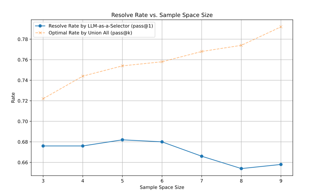 图 2 展示了随着采样空间(候选patch的数目)的增大,LLM-as-a-Selector的成功率和Optimal Rate(直接求并集)的变化。我们可以有如下观察: