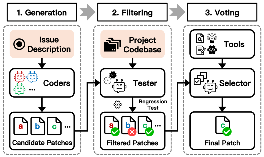 2.Filtering stage: 受启发于 Agentless,我们也设计了一个类似的Tester agent ,利用 regression test 过滤无法通过测试的 patch。