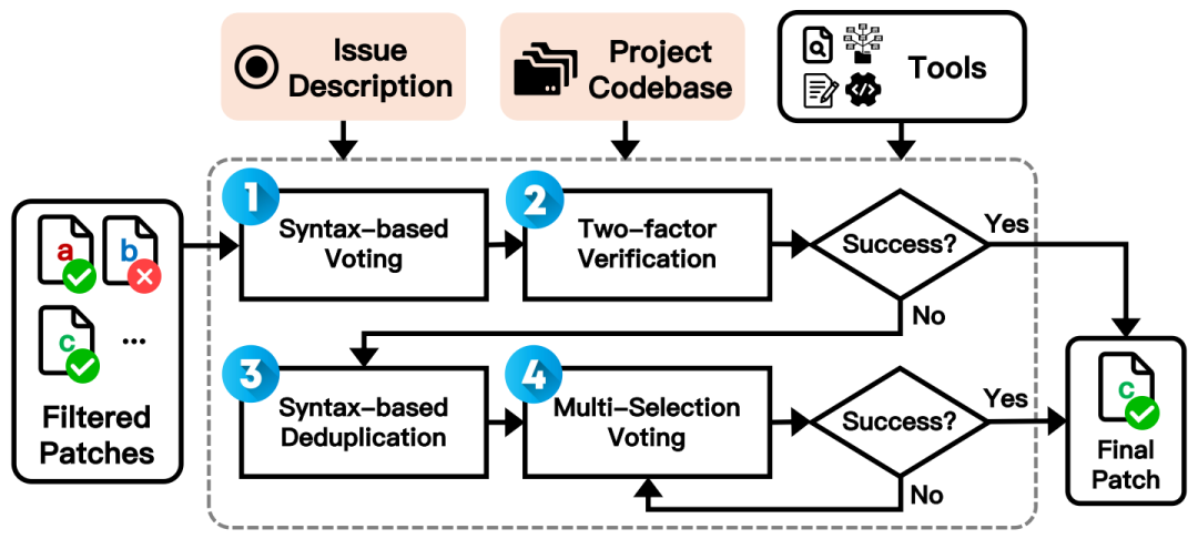 然而这个投票结果说明,当前返回的 patch 在不同的 Coder agent 中一致性较高,更可能具备正确性,因此我们还增加了基于 Selector agent 的双重验证,Selector agent 会利用上下文(issue description 和 project codebase)和四个 tools(str_replace_editor、Bash、ckg_tools 和 sequential_thinking_tool)对当前的 patch 的正确性进行验证,如果通过了双重验证则作为最终 patch。如果当前单一的 Selector agent 并不能确定当前 patch 的正确性,则放弃当前的 Syntax-based voting 的投票结果,而利用下一步的 multi-selection voting。