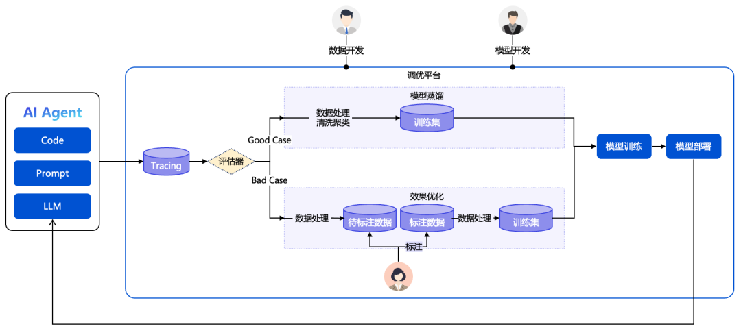 效果优化: 基于线上的 Bad Case 做下钻分析后,引导对 Agent 做进一步的迭代优化,比如 Prompt 的优化,比如将 Trace 经过人工清洗标注后沉淀为训练集,做模型 SFT。
