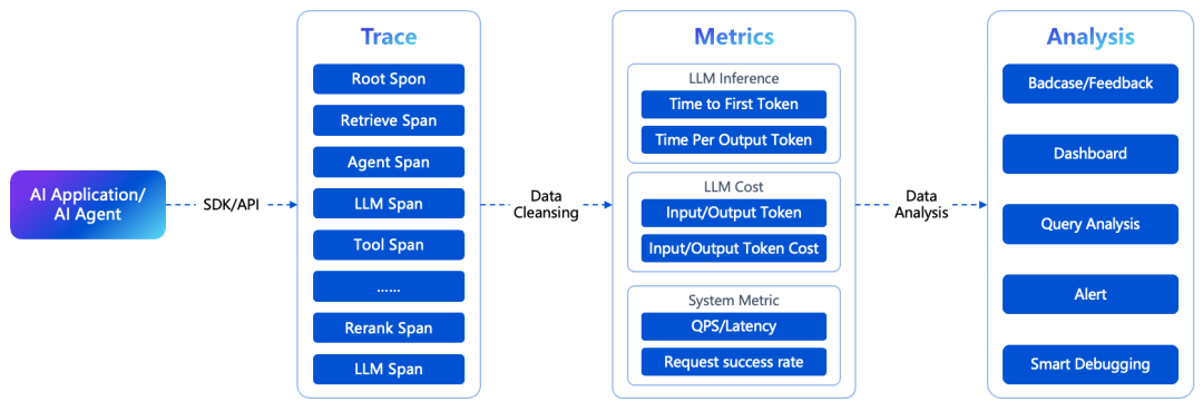 AI Agent 的运行过程中会产生运行数据,这些运行数据可以基于统一协议,如 Open Telemetry,上报到平台,沉淀为Trace。一条 Trace 就是一次 Query&Answer的一轮交互。每条 Trace 里又包含多种 span 组成,即节点,如模型调用的 span、插件执行的 span、retrieve 的 span 等等。基于 Trace,我们又可以通过 ETL 进一步清洗为 Metrics,并通过指标看板的形式展现给消费者,如 TTFT、TPOT、Token 消耗、Score,等等。最后基于线上 Trace 和指标,我们又可以进一步下钻分析 Bad Case、分析 Query 分布、给出线上运行预警,等等。