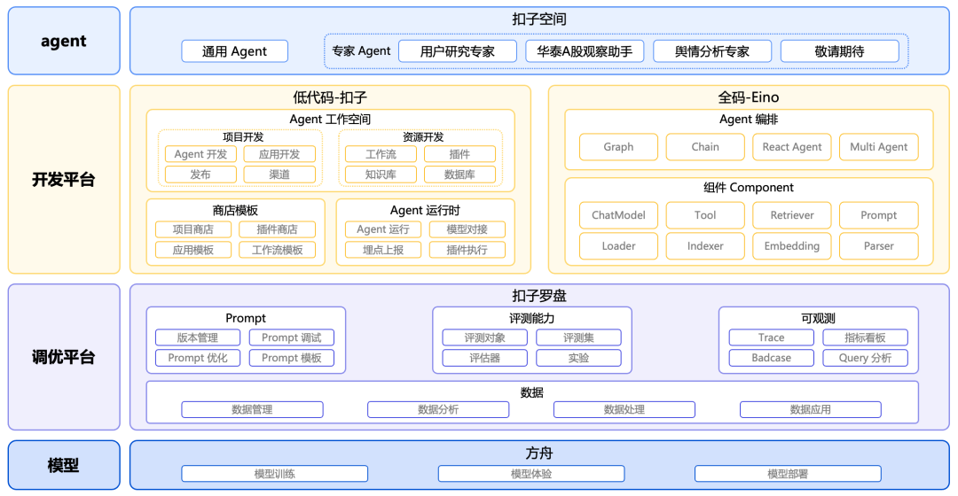 扣子在今年4月份进行了品牌升级,同时推出了产品矩阵,分别为扣子空间、开发平台、扣子罗盘及 Eino 框架。