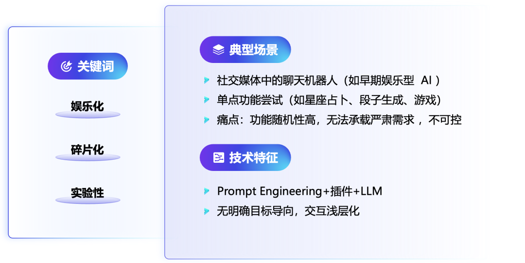 自2023年大模型爆火后,“Agent”、“智能体”作为新鲜事物, 快速引起了大家强烈的好奇心。如何开发智能体的话题,成为了科技博主的流量密码。由于泛娱乐的场景最能吸引 C 端用户的眼球,所以这个阶段的智能体很多以社交、娱乐、个人提效作为切入点,各方脑洞大开,涌现了很多创意十足的智能体,譬如:角色扮演的陪聊、星座占卜、游戏NPC、段子生成等等;