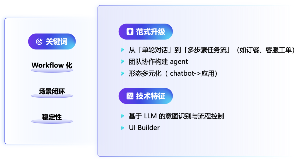 在技术特征上,基于 LLM 的意图识别和流程控制成为主流,同时因为交互形态的升级,需要一套 UI Builder 组件,高效的构建产品界面和交互。