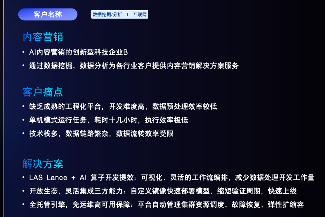 第二个案例是一个AI内容营销创新企业使用多模态数据湖的案例,客户通过数据挖掘、数据分析等方式,为各行业提供个性化的内容营销解决方案。