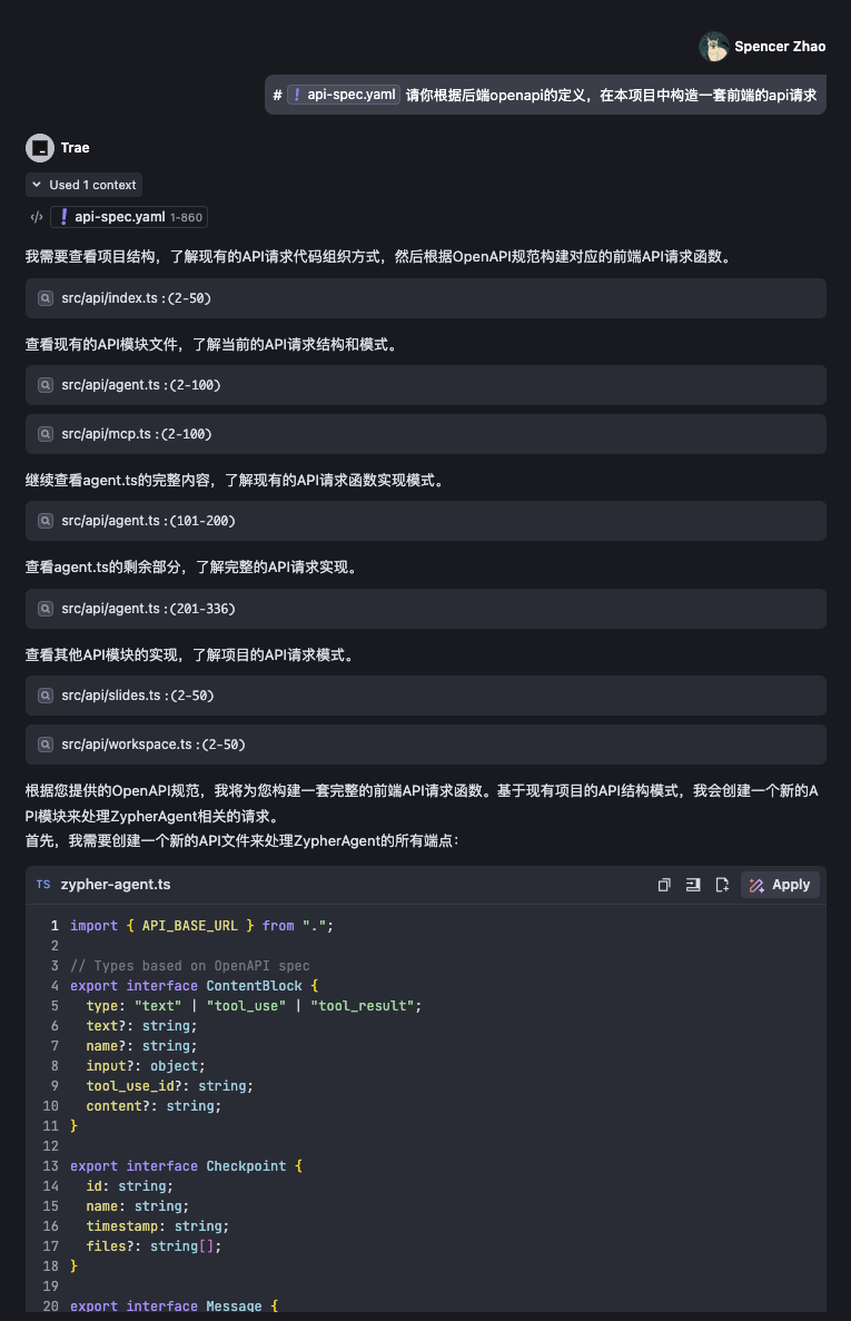 用户描述需求,TRAE 生成代码,点击 Apply,Zypher 驱动的 Agent 便自动调用文件编辑器精准落盘。这种“所说即所得”的开发方式,让构建 Agent 从繁重工程变为轻松对话。
