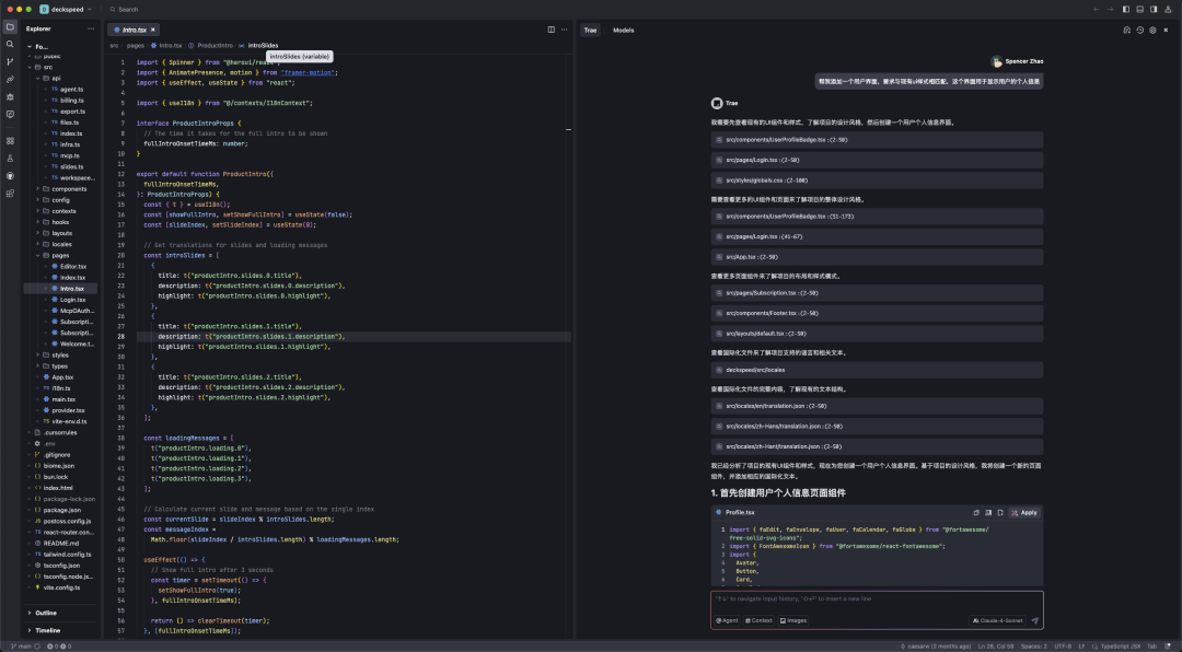 例如,在 DeckSpeed 开发中,CoreSpeed Inc.的工程师只需描述一句“生成一个卡片组件,支持 hover 动画,展示用户头像和名字”,TRAE 会基于当前代码风格与组件体系,生成包含状态管理、样式定义、响应逻辑的完整代码,同时与现有项目结构自然融合。Zypher 则会调度图表生成、样式提取、图片处理等工具,将视觉与功能层统一落地。
