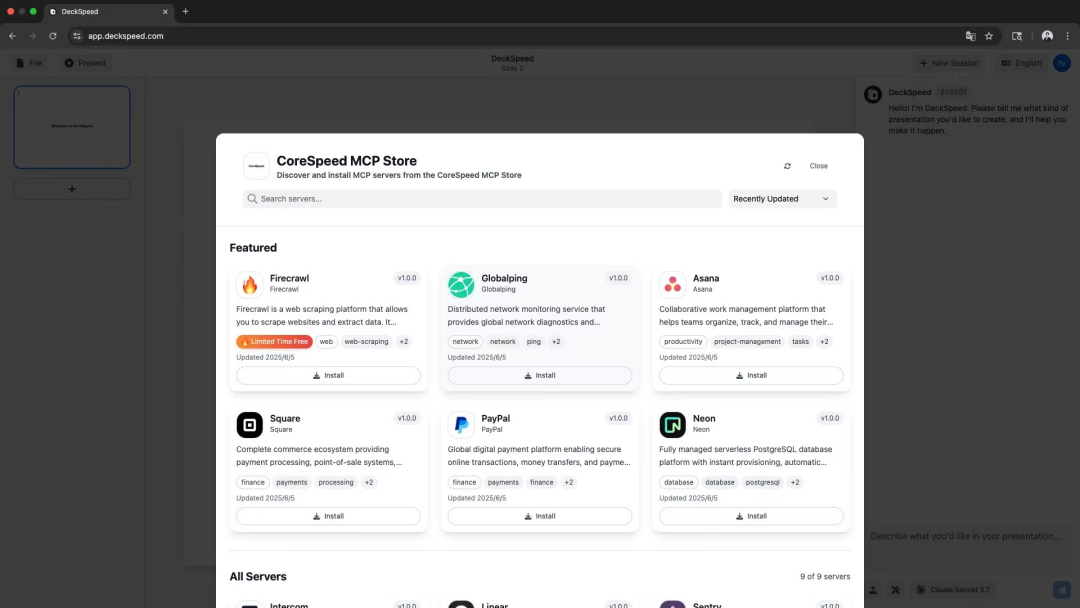 DeckSpeed 是全球首个支持 MCP 的演示文稿智能体,用户只需像老板一样把任务安排下去,通过自然语言对话表达想法,提出意见,就能得到专业、个性化的幻灯片,彻底告别模板束缚。