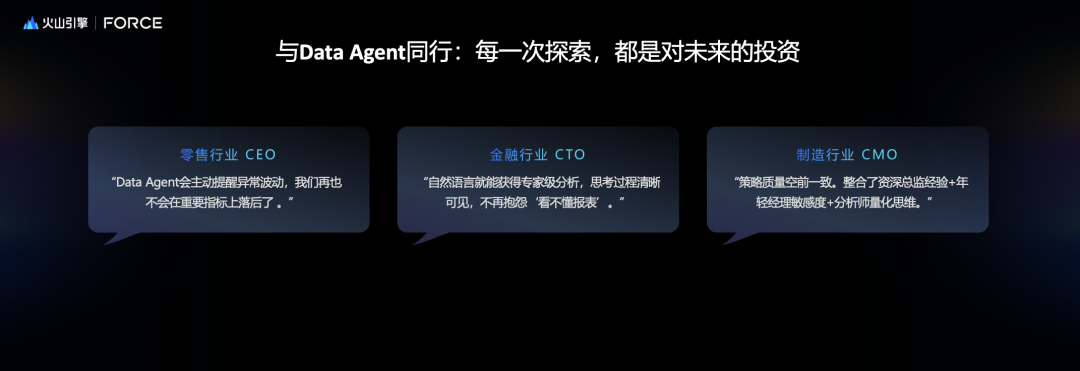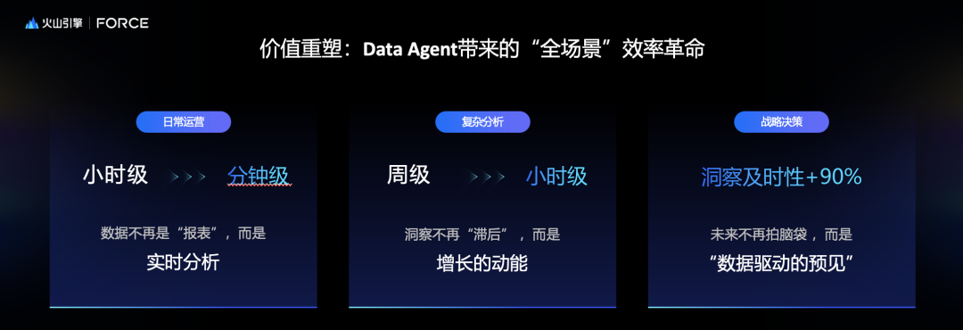 2、很多客户问的比较直接,现在投入是不是白投入了?能不能做一些不变的东西?其实我觉得数据不会变的,现在怎么用Data Agent,未来就是怎么用新的领域大模型应用。所以我们数据能力,对于决策速度依赖不会变。