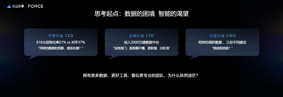 还有一些银行客户花了大量的钱建设数据中台、指标中台、BI 系统,但是为什么业务部门还抱怨看不懂数据?还有需要做一些策略,有同样的调研数据、用户数据,拿不同的营销策略,我到底该相信谁?