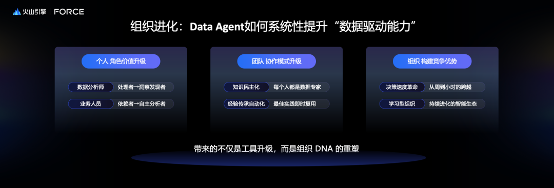 在这个过程中会有一些变化,以前说数据是资产,或者说未来知识是资产,但是未来随着员工跟Data Agent交流的越来越多,所有人问的问题也是一种资产,专家问的问题和新手问的问题是不一样的,所以那这就实现了隐性知识的传承。