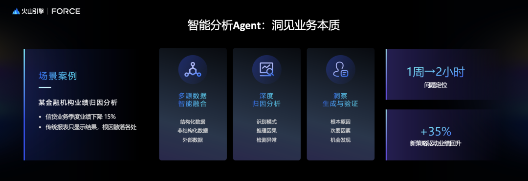那次要原因可能是大环境不好,客户需求下降了,同时发现一个机会,某一个细分品类里面有些方向可以发力——这种洞察在单一结构化数据归因里面是很难实现的,因为它来自于不同的来源的数据边缘所交汇的数据点,这是分析Agent所带来的洞察。