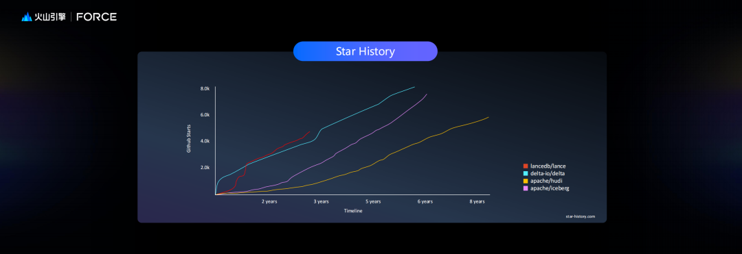 自2022年推出以来,LanceDB得到了开源社区的广泛支持。我们的数据格式(Lance Format)和表格式(Table Format)已成为发展最快的数据湖格式之一。