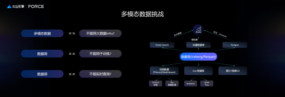 比如说一个很经典的场景,企业用ElasticSearch和向量数据库处理数据挖掘,依赖WebDataset等格式进行模型训练,再借助传统数据仓库完成模型评估,这样带来了巨大的开发和维护负担。