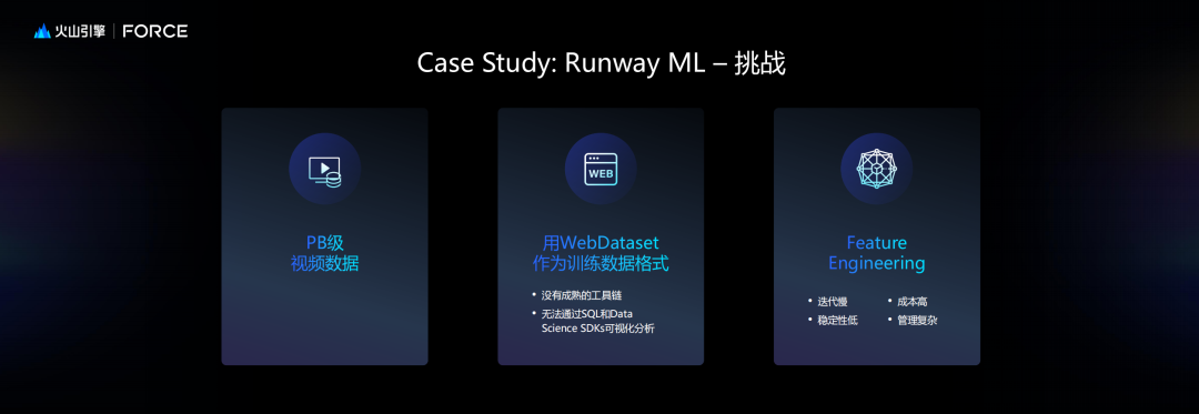Runway ML是一家专注于视频生成的AI公司,他们面临的挑战非常具有代表性。在采用LanceDB之前,Runway ML的技术团队需要处理数十PB规模的视频训练数据,这些数据以Web Dataset格式存储。