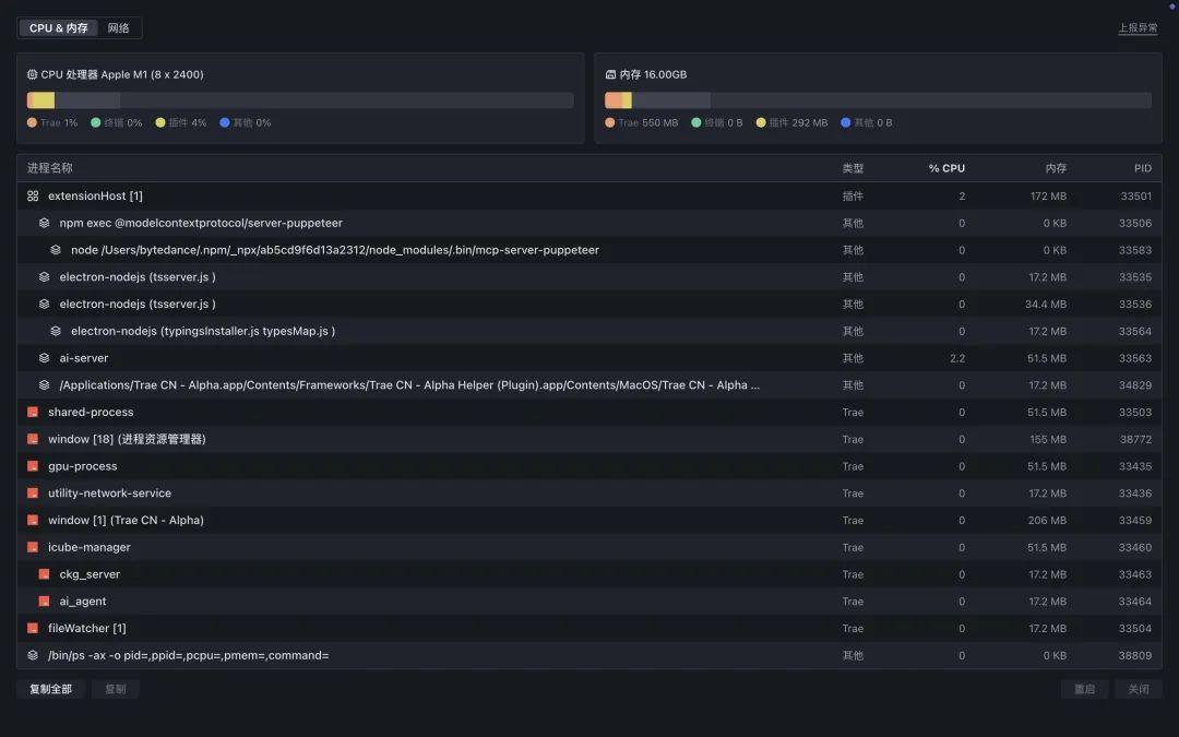 - 查看资源使用情况 :查看 TRAE IDE 整体以及各个进程单独的 CPU 和内存使用信息。