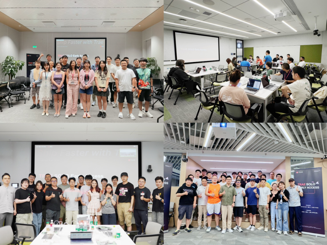 7 月 12 日,TRAE SOLO Early Access 内测活动 在北京、上海、杭州、深圳四地同步举办。上百名不同年龄、不同行业、不同岗位的 TRAE 用户齐聚,抢先体验还在内测中的 TRAE 全新模式—— SOLO,共同探索 AI 开发的新可能。