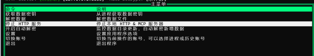 根据以上操作方法,依次选择获取数据密钥->解密数据->开启 HTTP 服务,这中间解密数据会比较耗时间,因为是对当前所有微信聊天记录进行解密,当以上步骤都完成后,界面显示如下: