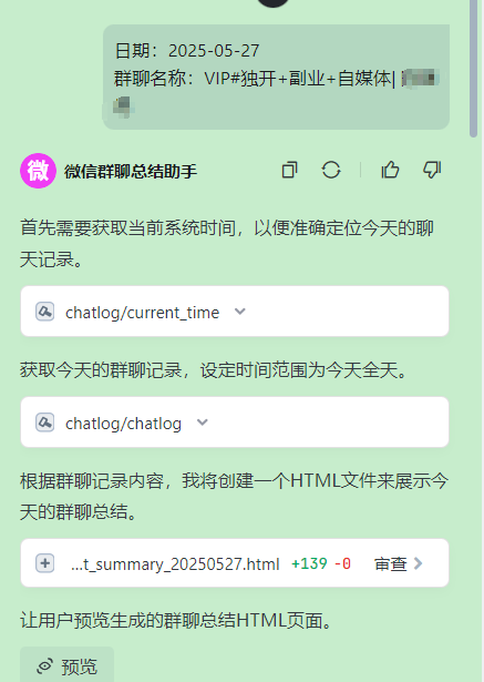 然后在 AI 聊天框中,@微信群聊总结助手,输入日期和群聊名称,然后 AI 就开始干活啦。
