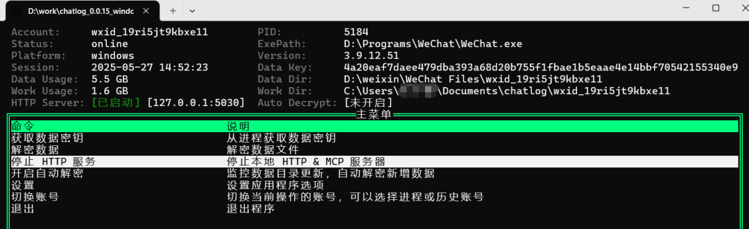 从图片中可以看到解密后数据存放路径,同样可以看到 http 服务已经成功启动,这样一个名为 Chatlog 的本地聊天记录服务就成功启动了。