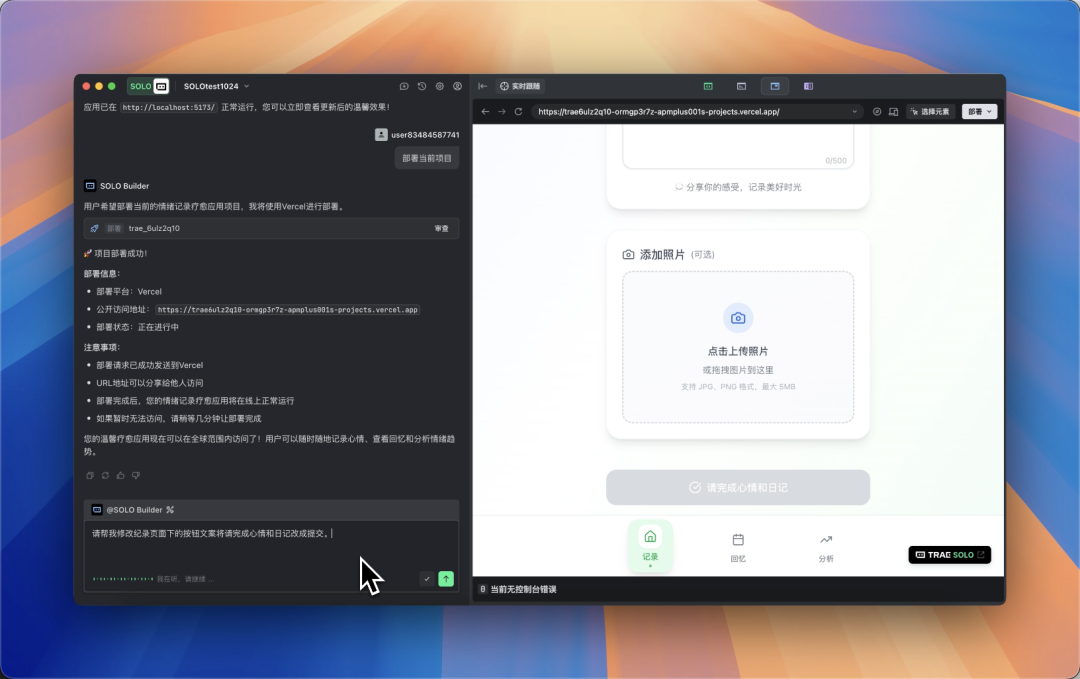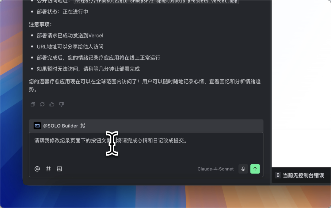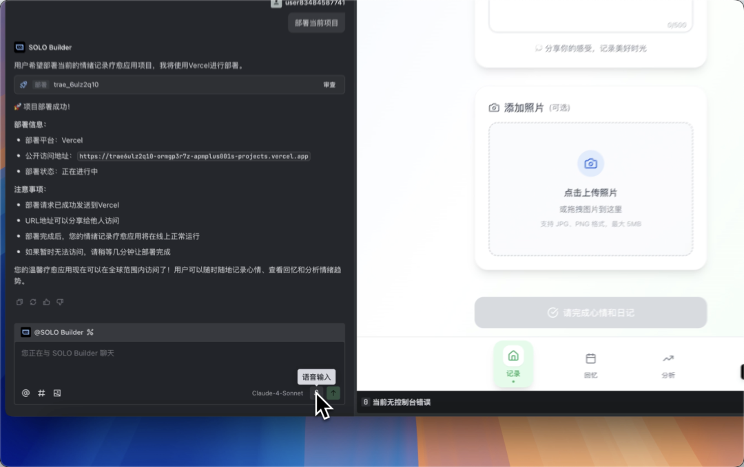 语音输入时,TRAE 将实时把语音转成文字,并即时填充到输入框内,输入过程高效可靠。