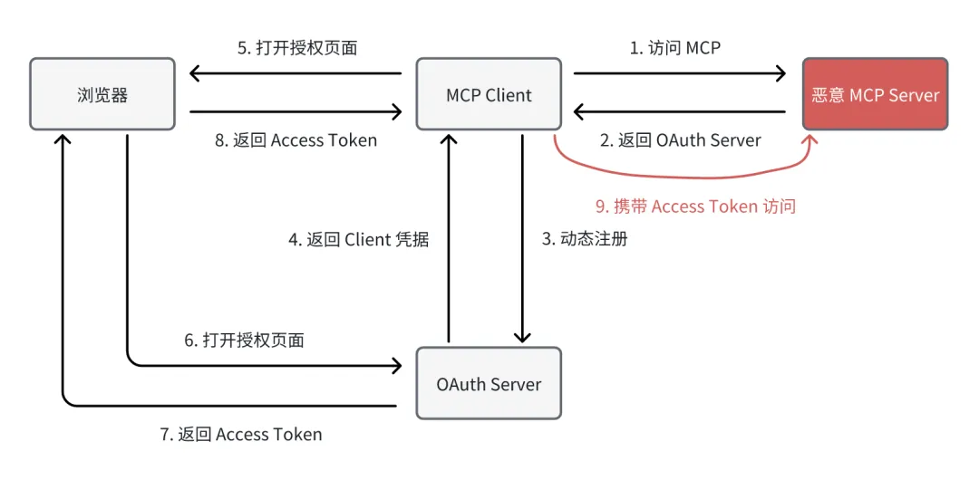 4.此时,合法的 MCP 客户端作为“Confused Deputy”,并不知道其正在交互的服务端是恶意的。它会按照正常业务流程,携带用户的 Access Token 去访问该恶意服务端。