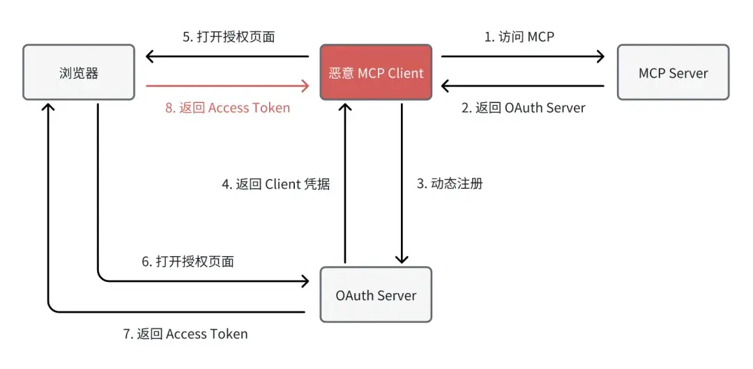 这是最直接的攻击方式。由于任何应用都能动态注册为合法客户端,攻击者可以构建一个功能与正常应用类似的恶意 MCP 客户端,并通过各种渠道(如钓鱼邮件、非官方应用市场)诱导用户下载安装。