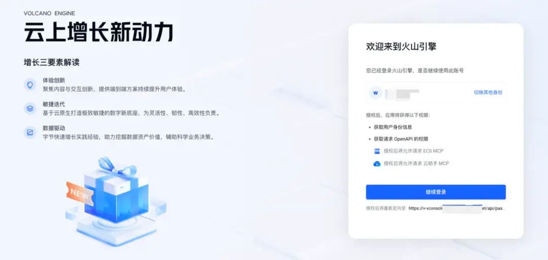 2.用户的浏览器被重定向到火山引擎的授权页面,用户输入凭证并同意授权。