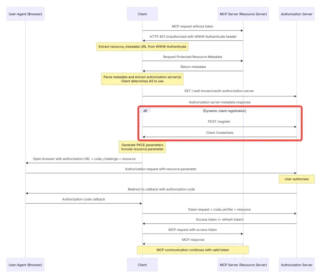 为了支撑这种高度灵活的接入模式,服务端无法像传统应用那样预先静态注册所有客户端。因此,MCP 官方文档采用了 OAuth 2.0 动态客户端注册协议(RFC 7591)。该协议允许客户端在 OAuth 授权流程中,通过向一个标准的 /register 端点发起请求,动态地获取合法的客户端凭证(client_id, client_secret)。这免除了开发者在授权服务提供商处进行繁琐的手动预注册流程,极大地降低了接入成本。